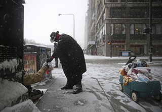 “Crusader Prime,” right, stops along Michigan Avenue to deliver food and a blanket to a homeless man, Dec. 14, 2013, in Chicago. (Brian Cassella/Chicago Tribune/MCT)