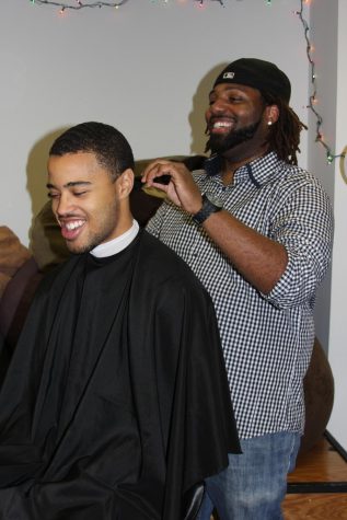 Barber Ron Scott gives senior business & entrepreneurship major Deavondre Jones a free haircut during The Barbershop, a program targeted at building community amongst black male students.