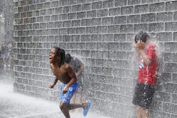 Xavier Scott runs through the waterfall next to Grant Park to stay cool in the 90-degree weather on Wednesday, July 23, 2025. (
