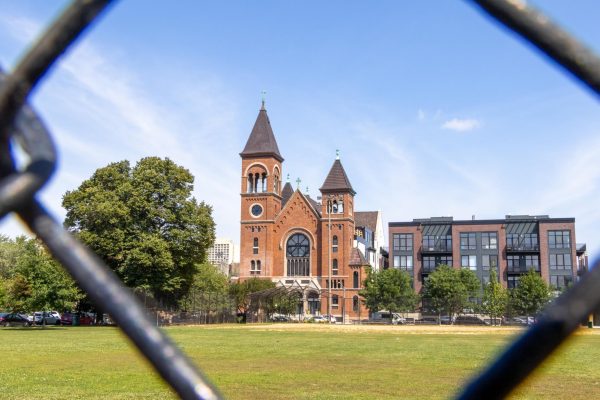 Former St. Boniface Church is seen through a fence in Noble Square on Monday, Aug. 11, 2025. It is the site of a conversion project set to create new condos in the area. (
