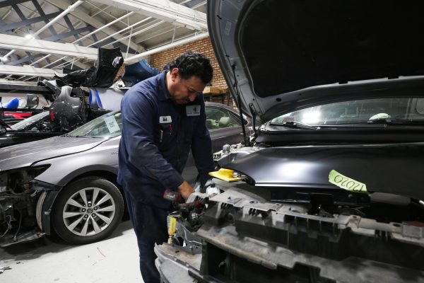 Raul González repairs a car with a missing bumper at Euro Collision auto shop in Edgewater, on Wednesday Aug. 13, 2025. (