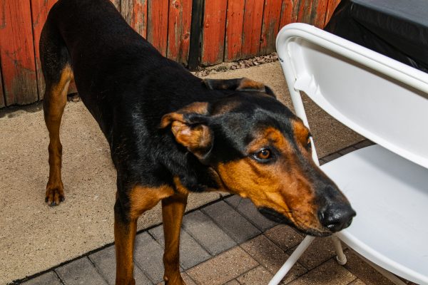 A dog looks around in a backyard on Monday, Aug. 4, 2025. (