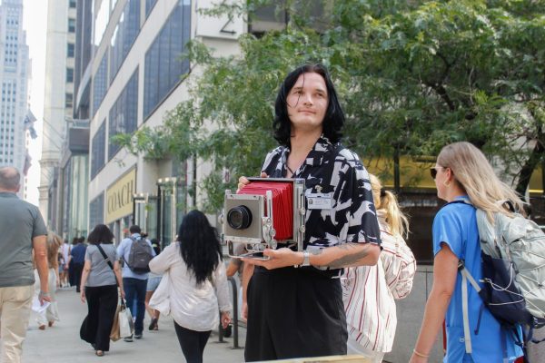 Vladislav Talelev holds a Burke and James box camera, with a Canon lens in the middle, offering to take “vintage photos” to passersby on North Wabash Avenue on Wednesday, Aug. 6, 2025. (