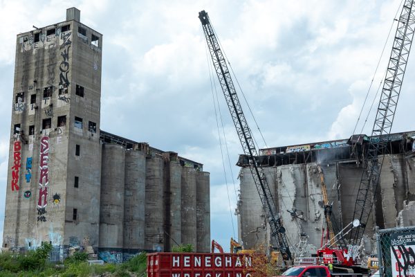 Debris falls as the historic Damen Silos are razed to the ground on Thursday, July 24, 2025. (