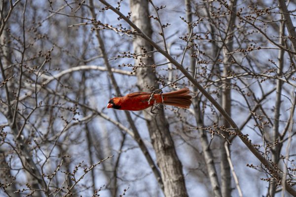 A Northern Cardinal dives from a tree branch in a park located on the eastern side of the Field Museum on Monday, March 10, 2025. (