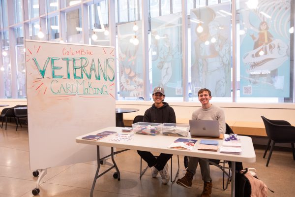 Student Life members Ziel Chonillo, a junior music business major, and Jack Hewitt, a junior musical theater major, set up a table to commemorate veterans on the first floor of the Student Center on Monday, Nov. 10, 2025. The table was equipped with thank-you cards, stickers with U.S. military imagery and pens to make cards for veterans to thank them for their service on Veterans Day. (Amelia Baird)