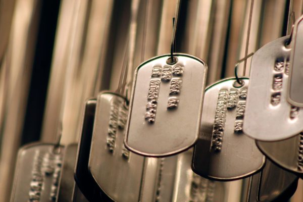 The “Above and Beyond” exhibition, presented by the National Veterans Art Museum, hangs from the third-floor ceiling of the Harold Washington Library on Tuesday, Nov. 11, 2025, honoring veterans who lost their lives while serving in the Vietnam War. (Sofía Oyarzún)