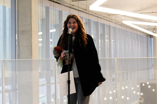 Julia Palen, a freshman acting major, says what she’s thankful for during a walk-up interview to be part of a video by the Campus Communications Department on Tuesday, Nov. 18, 2025. (