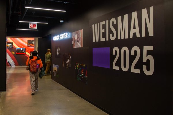 Students and staff enter the career center and pass the Weisman 2025 installation on the third floor of the Student Center on Thursday, Nov. 20, 2025. The award ceremony takes place on Thursday, Nov. 20, 2025 from 5-7 p.m. in the Student Center. (Dustin Janicki)