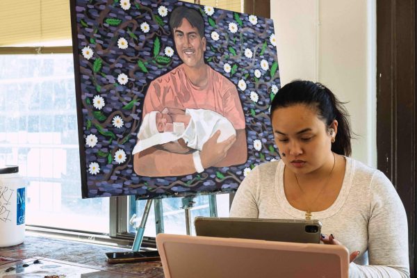 Brianna Ho, a senior illustration major, displays her hand-painted portrait of her boyfriend and daughter while studying at the 623 S. Wabash Ave. building on Monday, Nov. 3, 2025. (