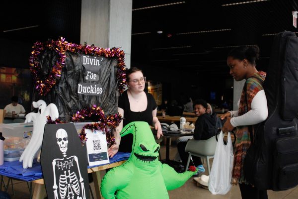 Samantha Rogan, programming and marketing coordinator for the Student Center, introduces the Divin’ for Duckies game as part of Wicked Week to Guana Colinet, a senior film major, on Tuesday, Oct. 28, 2025. (