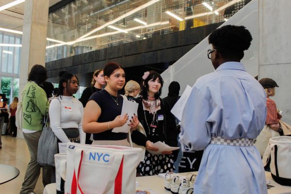 Ximena Torres Rivera and Meghan Shaver, both junior fashion majors, talk to representatives of the Lands’ End clothing brand at the Fashion Career Fair at the Student Center on Tuesday, Oct. 7, 2025. (