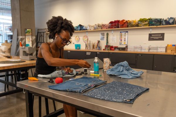 Tachinnah Tyler, a junior film and television major, makes alterations to her clothing at the Makerspace in the Student Center on Friday, Sept. 19, 2025. (