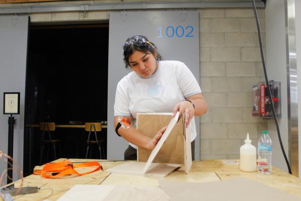 Mea Cortez, a junior animation major, assembles a pedestal for her sculpture class in the Fabrication Facility at 623 S. Wabash Ave. on Friday, Sept. 26, 2025. (