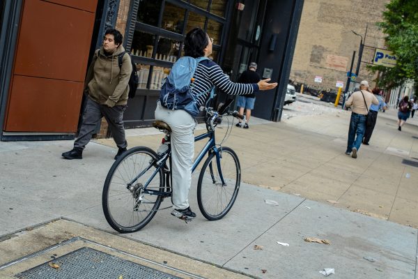 A biker checks if it’s raining on S. Wabash, Wednesday, Sept. 3, 2025. (