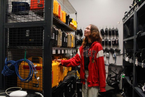 Viola Everett, a senior photography major, organizes supplies in the equipment room of the photo studio at 1104 S. Wabash Ave. on Tuesday, Sept. 30, 2025. (